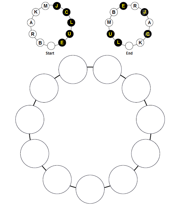 The bottom disc is left vacant. Challenge: Spell the word "Lumberjack" in a clockwise direction, leaving the bottom disc vacant. The black counters move clock wise. The white counters move the opposite way. (counter-clockwise) A counter may jump over one of the opposite colour if a vacant disc is next to it. A counter cannot jump over one of its own colour. Spell "lumberjack" in 26 moves. Download the template here. Watch the video |